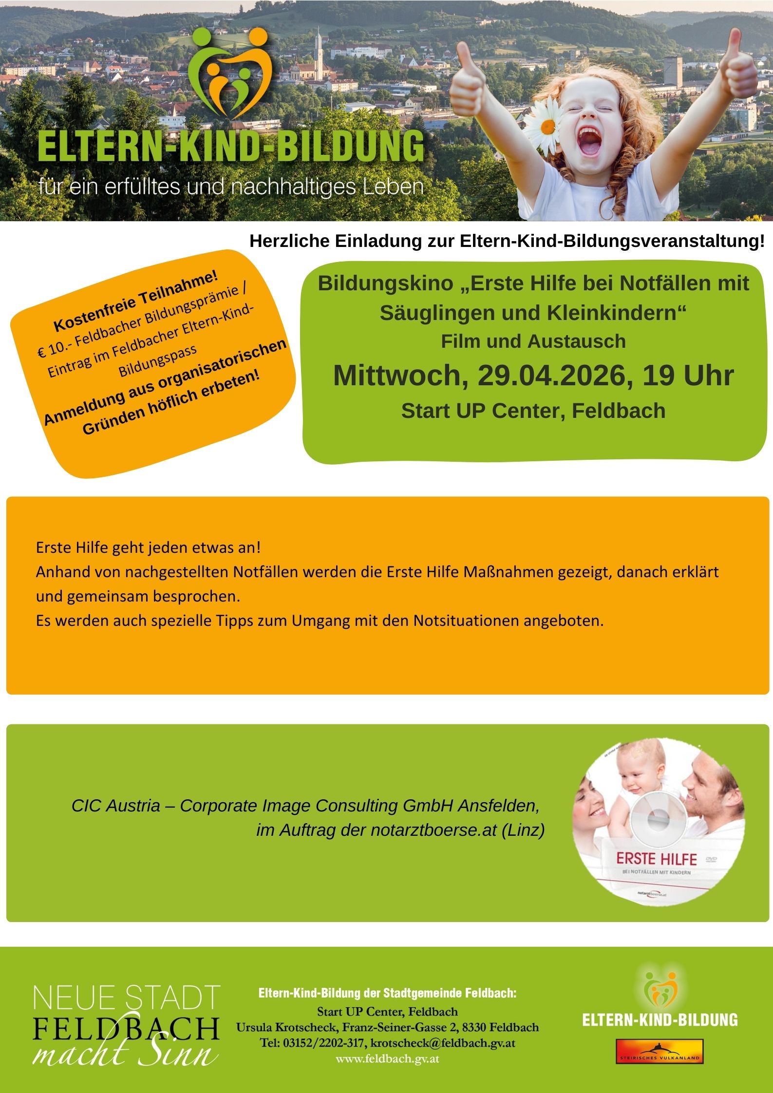 BILDUNGSKINO „Erste Hilfe bei Notfällen mit Säuglingen und Kleinkindern“ – Mittwoch, 29.04.2026, 19 Uhr, Start UP, Feldbach